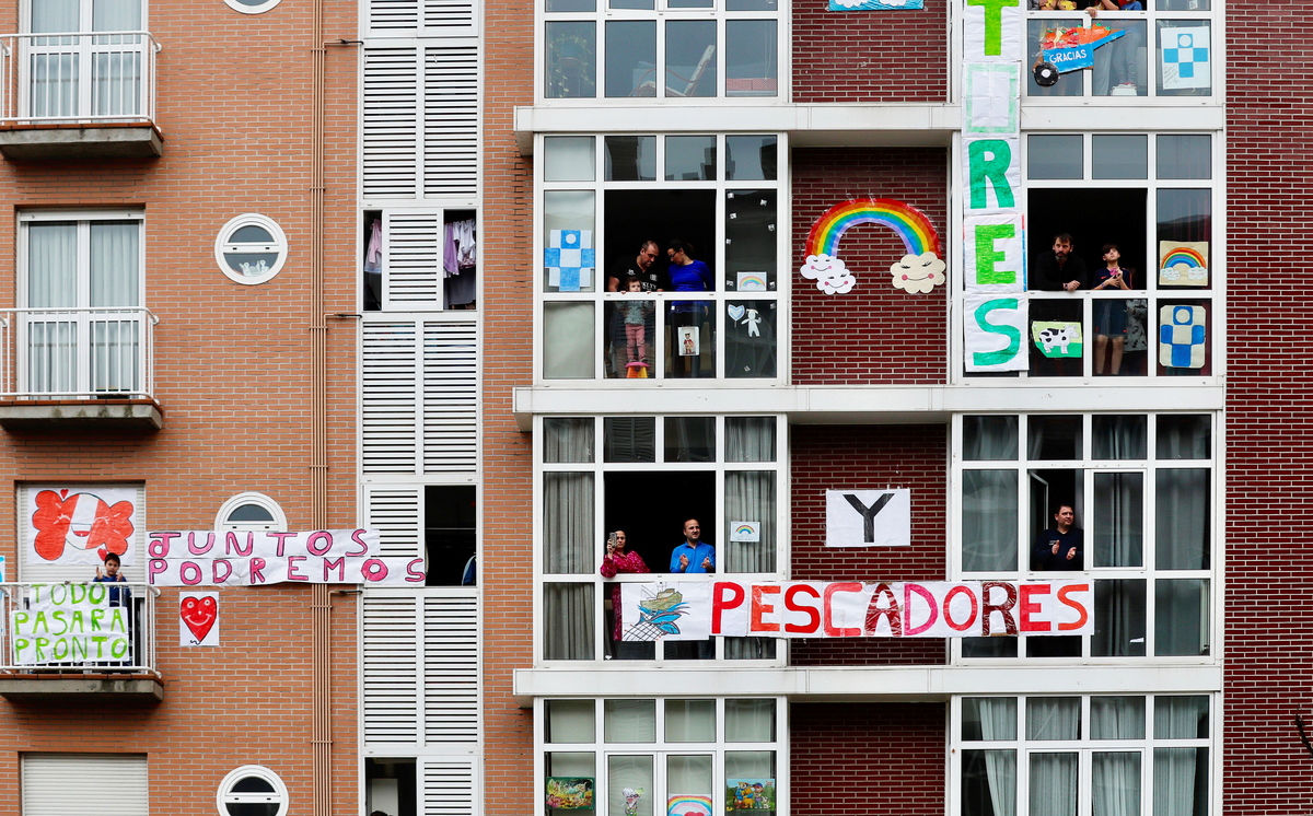 epa08376120 General view of decorated facades and balconies with messages supporting ranchers, farmers, and fishermen amid the ongoing coronavirus COVID-19 pandemic in Oviedo, northern Spain, 21 April 2020. The Spanish government declared the state of emergency on 14 March 2020 and the Mediterranean country has since been under strict lockdown in a bid to slow down the spread of the pandemic COVID-19 disease caused by the SARS-CoV-2 coronavirus. EPA/J.L. CEREIJIDO