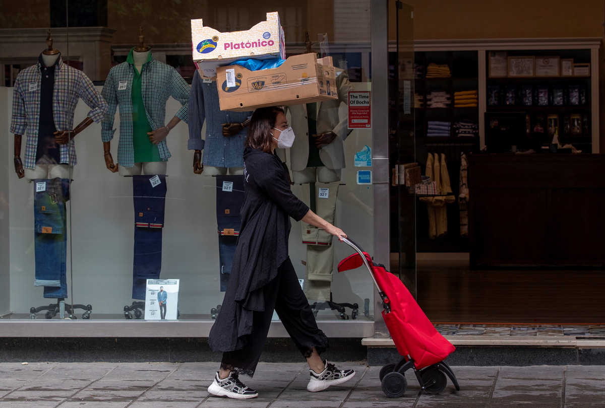 epa08417196 A woman wearing a protective mask carries some boxes on her head as she walks on the streets of Seville, Spain, 12 May 2020. Seville is one of the provinces on phase one of the lockdown exit plan amid the ongoing COVID-19 coronavirus pandemic, while moving from one stage to another depends on the coronavirus situation of each Spanish province. EPA/Julio Munoz