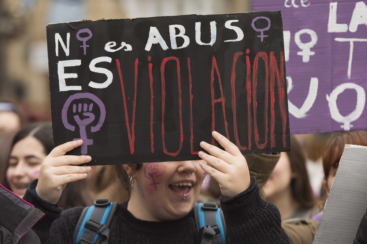 epa06725266 A student holds a banner that reads 'It is not abuse, it is rape', as hundreds of people protest against the judicial decision in the so-called La Manada case in Vitoria, basque Country, northern Spain, 10 May 2018. The verdict sentenced all five accused to nine years imprisonment for sexual abuse of a young woman during San Fermines fiestas back in 2016. The sentence has caused a national outrage and several protests against the judge's decision to not consider the act as a rape as, according to the sentence, there was no violence. EPA/David Aguilar