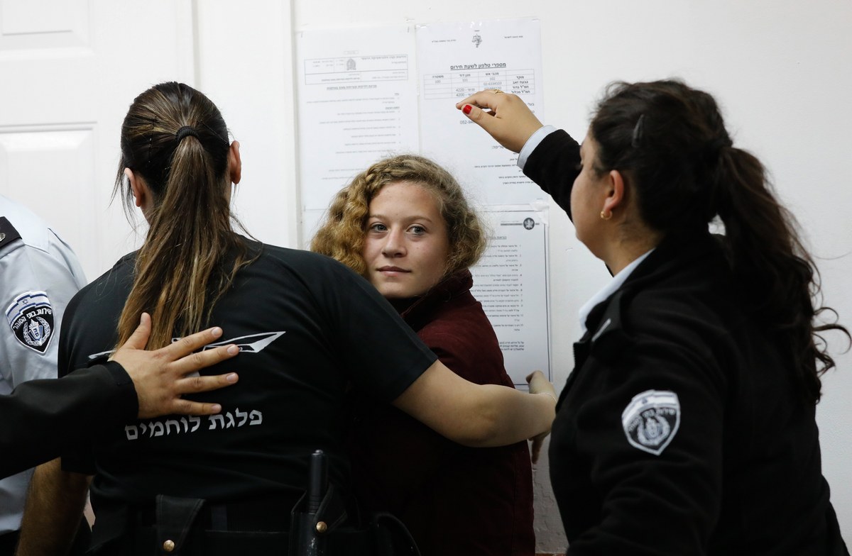 epa06399654 17 year old Palestinian Ahed Tamimi (C), a campaigner against Israel's occupation, appears at a military court at the Israeli-run Ofer prison in the West Bank village of Betunia, 20 December 2017. Reports state that the Israeli army arrested Tamimi on 19 December 2017, after a video was posted of her slapping Israeli soldiers in the occupied West Bank as they remained impassive. EPA/ABIR SULTAN