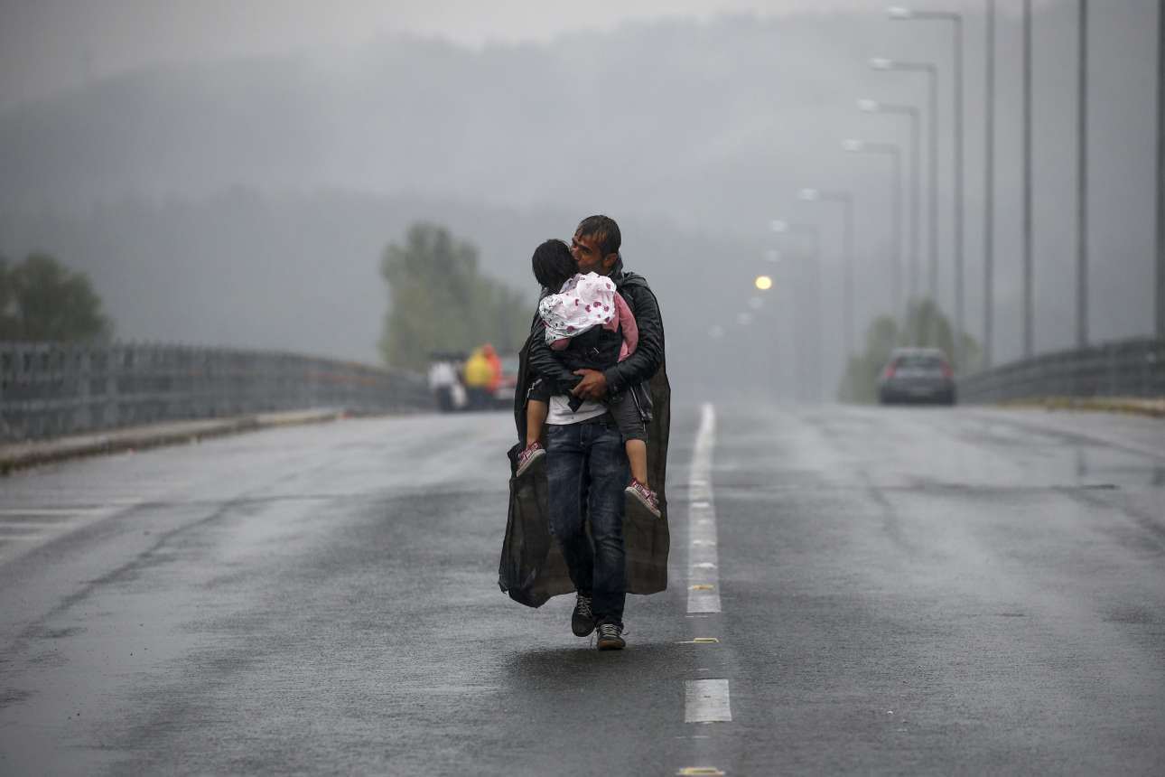 Στη φωτογραφία ένας Σύρος πρόσφυγας κρατά στην αγκαλιά του την κόρη του και περπατάει στη μέση του δρόμου. Στους ώμους του φοράει μια αυτοσχέδια μπέρτα, φτιαγμένη από μια μαύρη σακούλα σκουπιδιών.