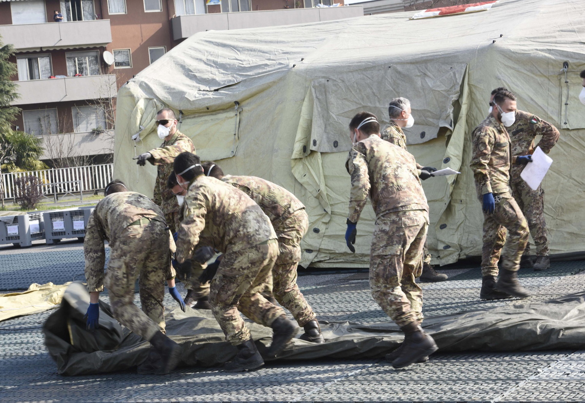 epa08309991 Italian soldiers set up a tent city for people infected with coronavirus outside a hospital in Crema, northern Italy, 20 March 2020. The number of deaths from the pandemic COVID-19 disease caused by the SARS CoV-2 coronavirus in Italy has now surpassed the death toll for all of China, where the outbreak originated. According to the Civil Protection agency, the total number of confirmed infections has risen to more than 41,000, while over 3,400 people have lost their lives to the disease in the Mediterranean country. EPA/STEFANO CAVICCHI