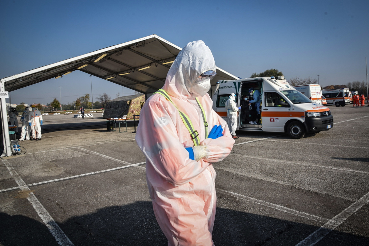 epa08809520 Medical personnel transport a Covid-19 patient to a coronavirus facility area set up by the Italian army to lighten the workload for hospitals in Via Novara, in Milan, Italy, 09 November 2020. Patients infected with coronavirus are transported in a triage operation to temporary Covid-19 facilities run by Italian Army to help hospitals with treating the patients during pandemic. EPA/MATTEO CORNER