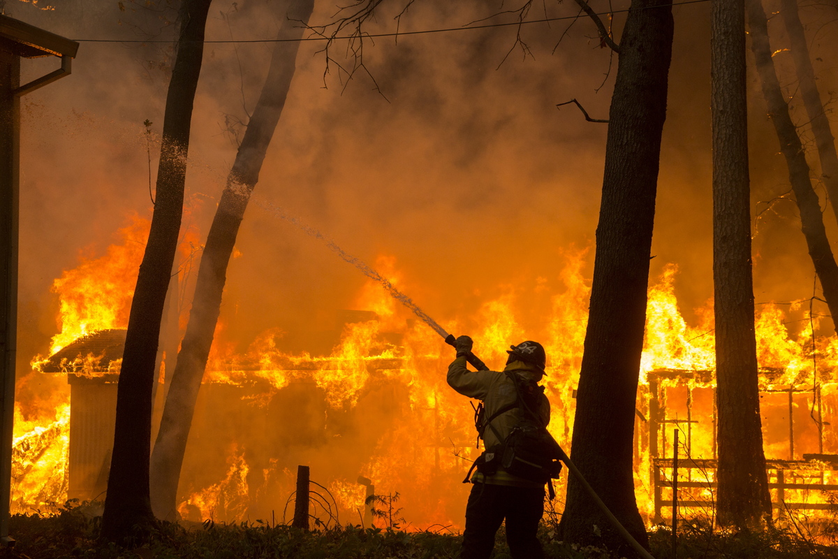 epaselect epa07154463 A CalFire firefighter attempts to cool down the side of a home in the Paradise Pines neighborhood of Magalia as the Camp Fire continues to burn out of control through the region, fueled by high winds in Butte County, California, USA, 09 November 2018. The nearby communities of Pulga, Paradise and Concow, have been ordered to evacuate the area. EPA/PETER DASILVA