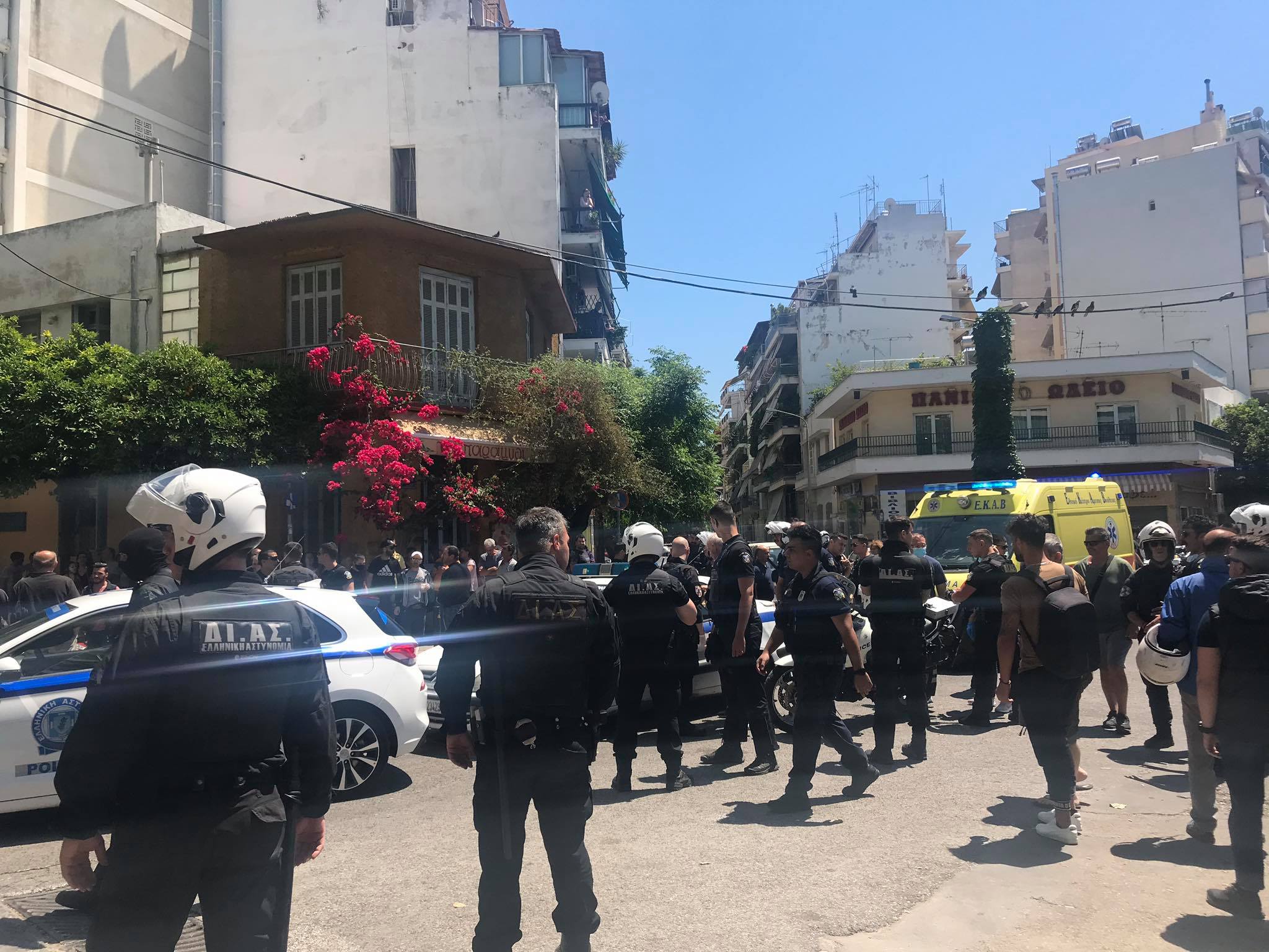 Την εικόνα επιβεβαιώνουν και περιγραφές αυτοπτών μαρτύρων που είδαν στο κράσπεδο τη λίμνη αίματος από το κεφάλι του Β.Γ. και κάλεσαν το ΕΚΑΒ, αλλά οι αστυνομικοί έδιωξαν το πλήρωμα με την αιτιολογία ότι έπρεπε πρώτα να οδηγήσουν τους 24χρονους στο Τμήμα. Η «Εφ.Συν.» επικοινώνησε με τον πρόεδρο του Σωματείου Εργαζομένων του ΕΚΑΒ, Γιώργο Μαθιόπουλο, ο οποίος επιβεβαίωσε ότι «με εντολή αξιωματικού ζητήθηκε από το πλήρωμα του ασθενοφόρου να αποχωρήσει» επειδή ήταν σε εξέλιξη διαδικασία προσαγωγής («Εφ.Συν.» 27/5).