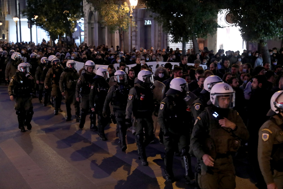 Αριστερές οργανώσεις πραγματοποιούν πορεία διαμαρτυρίας από τα προπύλαια προς τη Βουλή κατά της αστυνομικής βίας με αφορμή τα γεγονότα στο Πέραμα όπου ένας άντρας έπεσε νεκρός από πυρά της αστυνομίας μετά από καταδίωξη, Δευτέρα 25 Οκτωβρίου 2021. ΑΠΕ-ΜΠΕ / ΑΠΕ-ΜΠΕ / ΓΙΩΡΓΟΣ ΒΙΤΣΑΡΑΣ