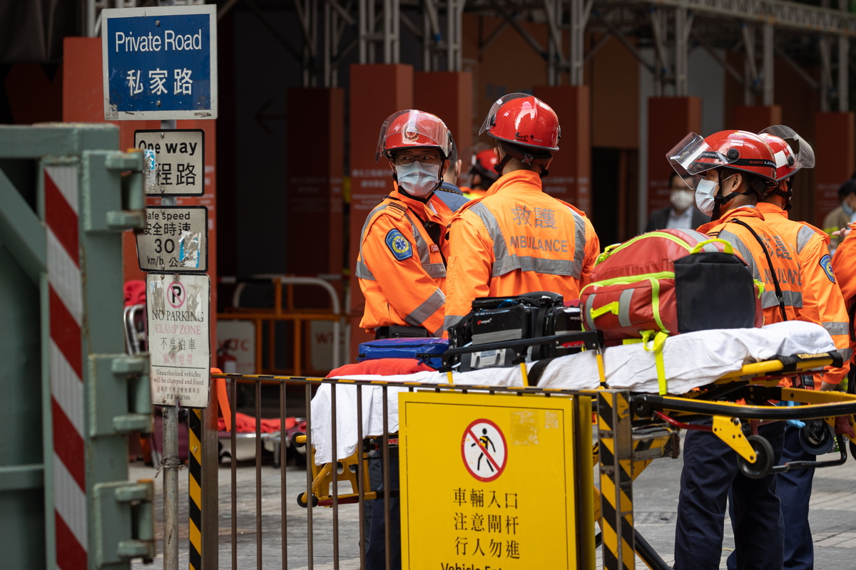epa09642655 Police and firefighter stand outside the World Trade Centre building in Causeway Bay, Hong Kong, China, 15 December 2021. Around 1,200 people were evacuated from the building following an electrical fire that injured at least 13, while hundreds were still trapped on the roof. EPA/JEROME FAVRE