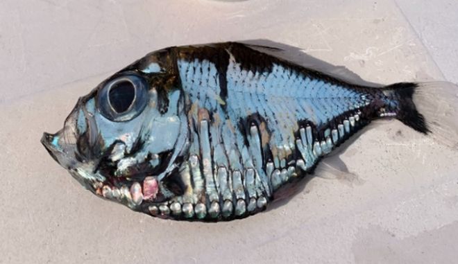 Το ψάρι με ασυνήθιστα μεγάλα μάτια, το μεταλλικό χρώμα και τους γαλάζιους ιριδισμούς εντυπωσίασε με την εμφάνισή του.
