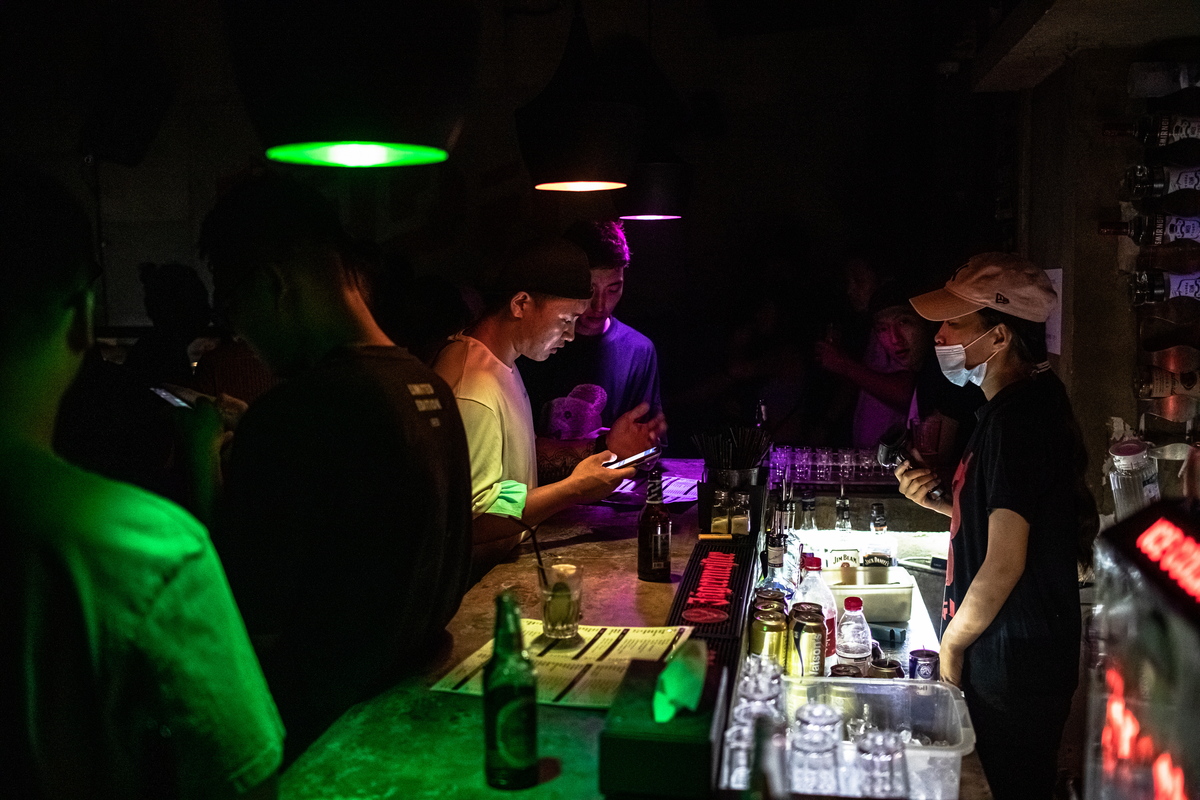 epa08580206 People buy drinks at a nightclub that was recently reopened after the outbreak of the coronavirus disease in Beijing, China, early 02 August 2020. Daily life in Beijing is slowly returning to normal after a second wave of COVID-19 cases in the city. EPA/ROMAN PILIPEY
