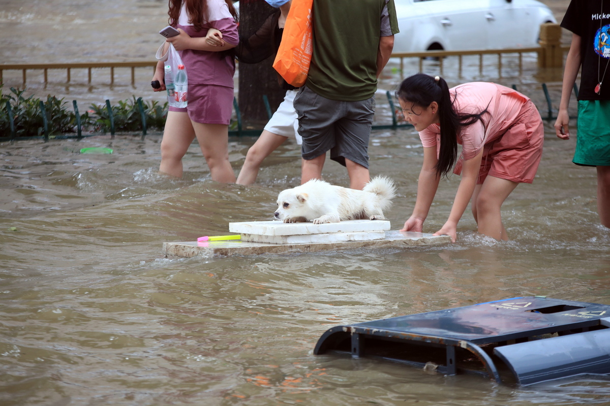 epa09356175 A girl plays with her pet dog in the flooded road after record downpours receded in Zhengzhou city in central China's Henan province, 21 July 2021. Heavy floods in Central China killed 12 in Zhengzhou city due to the rainfall yesterday, 20 July 2021, according to official Chinese media. Over 144,660 people have been affected by heavy rains in Henan Province since July 16, and over 10,000 had to be relocated, the provincial flood control and drought relief headquarters said Tuesday. EPA/FEATURECHINA CHINA OUT