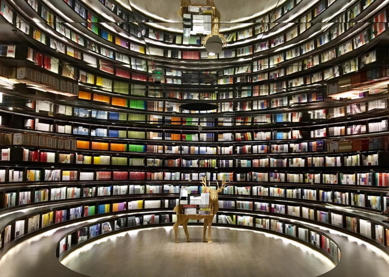 Το Zhongshuge, ένα βιβλιοπωλείο και βιβλιοθήκη στην περιοχή Γιάνγκζου, στην ανατολική Κίνα, έχει μεταμορφώσει τον χώρο σε ένα μέρος χωρίς τέλος, χάρη σε ένα έξυπνο κόλπο με τους καθρέφτες. Υπάρχουν άλλα δύο βιβλιοπωλεία σαν κι αυτό, στη Σανγκάη και το Χάνγκζου.