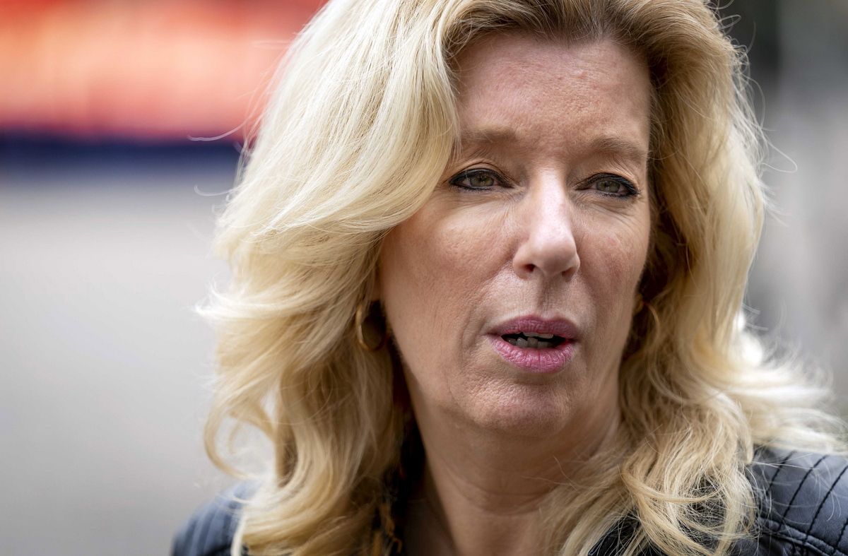 epa09081240 50PLUS party leader Liane den Haan arrives at the Binnenhof, in The Hague, The Netherlands, 18 March 2021. The Dutch House of Representatives elections were held on 17 March, the formation discussions to form a government will now take place in the Stadhouderskamer of the Binnenhof government buldings complex. EPA/BART MAAT