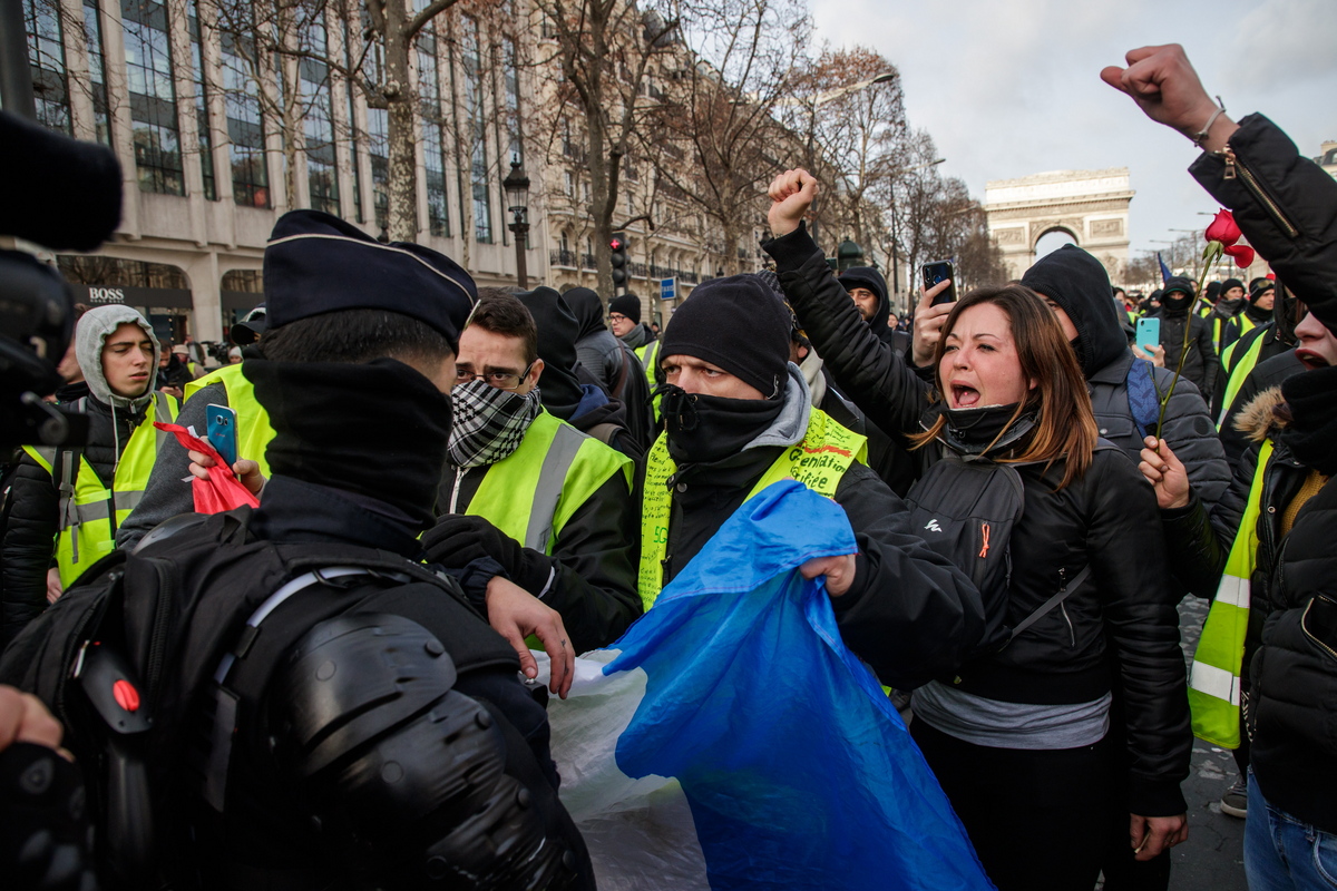 epa07354693 Protesters from the 'Gilets Jaunes' (Yellow Vests) movement face the police forces on the Champs Elysees during the 'Act XIII' demonstration, the 13th consecutive national protest on a Saturday, in Paris, France, 09 February 2019. The so-called 'Gilets Jaunes' is a grassroots protest movement with supporters from a wide span of the political spectrum, that originally started with protest across the nation in late 2018 against high fuel prices. The movement in the meantime also protests the French government's tax reforms, the increasing costs of living and some even call for the resignation of French President Emmanuel Macron. EPA/CHRISTOPHE PETIT TESSON