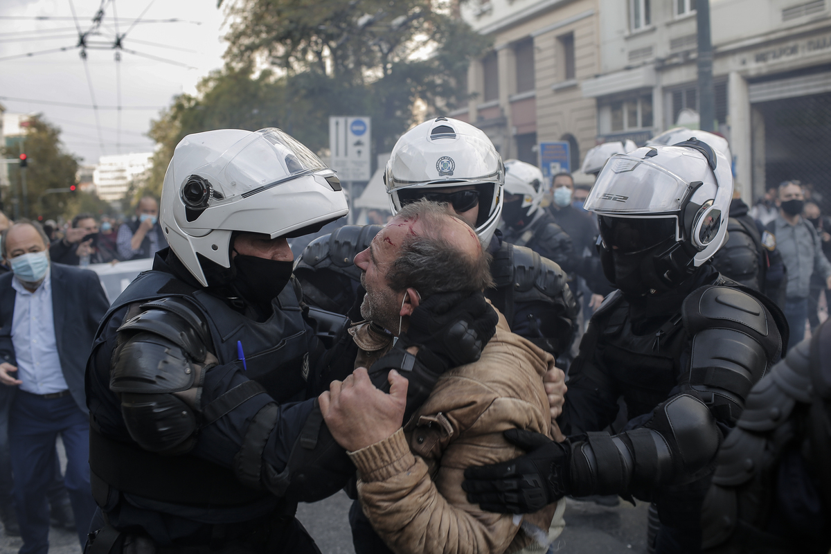 Αστυνομικοί συλλαμβάνουν διαδηλωτή κατά τη διάρκεια επεισοδίων που σημειώθηκαν για την 47η επέτειο της Εξέγερσης του Πολυτεχνείου, στο κέντρο της Αθήνας, Τρίτη 17 Νοεμβρίου 2020. Κατά τη διάρκεια πορείας μελών του ΚΚΕ, παρουσία βουλευτών και του γ.γ. του κόμματος Δημήτρη Κουτσούμπα προκλήθηκε ένταση μεταξύ διαδηλωτών και αστυνομικών. Η 47η επέτειος της Εξέγερσης του Πολυτεχνείου όπως είχε ανακοινωθεί, θα εορτασθεί φέτος χωρίς την καθιερωμένη πορεία καθώς υπάρχει απαγόρευση των συναθροίσεων άνω των τριών ατόμων και το Πολυτεχνείο θα παραμείνει κλειστό, στο πλαίσιο των μέτρων για την αποφυγή διάδοσης του κορονοϊού. ΑΠΕ-ΜΠΕ/ΑΠΕ-ΜΠΕ/ΚΩΣΤΑΣ ΤΣΙΡΩΝΗΣ