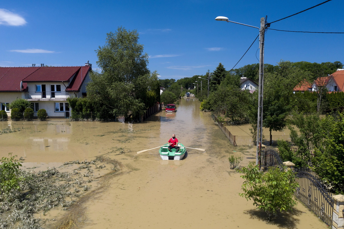 epa08760912 YEARENDER 2020 CLIMATE CHANGE A man wearing a protective face mask navigates a rowboat through the flooded streets in the town of Jaslo, southeastern Poland, 28 June 2020. A storm with heavy rainfall hit the Podkarpacie region in the afternoon and evening of the previous day, causing serious damage to infrastructure and properties. EPA/DAREK DELMANOWICZ POLAND OUT