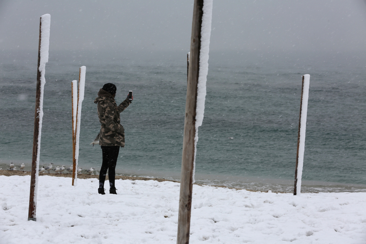 Μία γυναίκα κάνει βόλτα στη χιονισμένη παραλία με τη θάλασσα στο βάθος να αχνίζει, καθώς συνεχίζεται η πυκνή χιονόπτωση στα νότια προάστια της Αθήνας, Τρίτη 16 Φεβρουαρίου 2021. Συνεχίζεται η σφοδρή κακοκαιρία με έντονα φαινόμενα και πυκνές χιονοπτώσεις που έχουν κλείσει πολλούς δρόμους και έχουν δημιουργήσει έντονα προβλήματα στις μετακινήσεις. ΑΠΕ-ΜΠΕ/ΑΠΕ-ΜΠΕ/ΑΛΕΞΑΝΔΡΟΣ ΜΠΕΛΤΕΣ