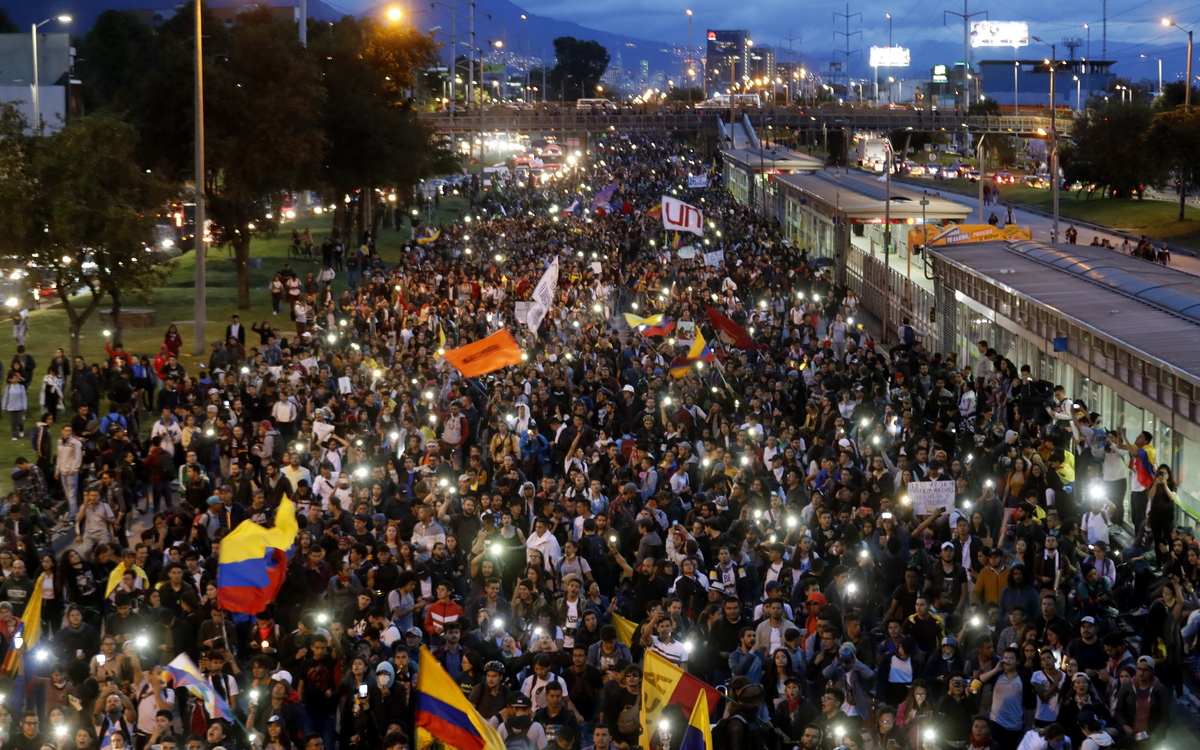 Χθες Πέμπτη, μόλις έπεσε η νύκτα, οι συγκρούσεις μεταξύ διαδηλωτών και αστυνομίας επαναλήφθηκαν στην κολομβιανή πρωτεύουσα. Βίαιες συγκρούσεις ξέσπασαν επίσης στη Μεντεγίν και την Κάλι.