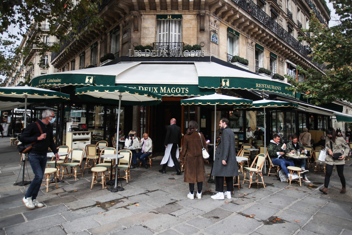 Άνθρωποι κάθονται στην βεράντα του εστιατορίου «Les Deux Magots», που άνοιξε το 1885 και θεωρείται ως ένα από τα παλαιότερα καφενεία της πόλης, Παρίσι, Γαλλία, στις 6 Οκτωβρίου 2020. Το Les Deux Magots παραμένει ανοιχτό, αφού οι γαλλικές αρχές διέταξαν να κλείσουν μόνο τα μπαρ στο Παρίσι, από τις 06 Οκτωβρίου 2020, λόγω της απότομης αύξησης του αριθμού των μολύνσεων Covid-19. Τα εστιατόρια θα παραμείνουν ανοιχτά εάν επιβάλλουν αυστηρούς κανόνες υγείας και υγιεινής. EPA / MOHAMMED BADRA