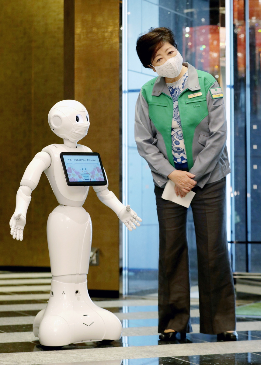 Η Κυβερνήτης του Τόκιο Yuriko Koike ποζάρει με το ανθρωποειδές ρομπότ Pepper, σε ξενοδοχείο που προορίζεται για άτομα με λοίμωξη από τον νέο κοροναϊό, που εμφανίζουν ήπια συμπτώματα της ασθένειας Covid-19. Τόκιο, Ιαπωνία, 1η Μαΐου 2020. EPA / JIJI PRESS