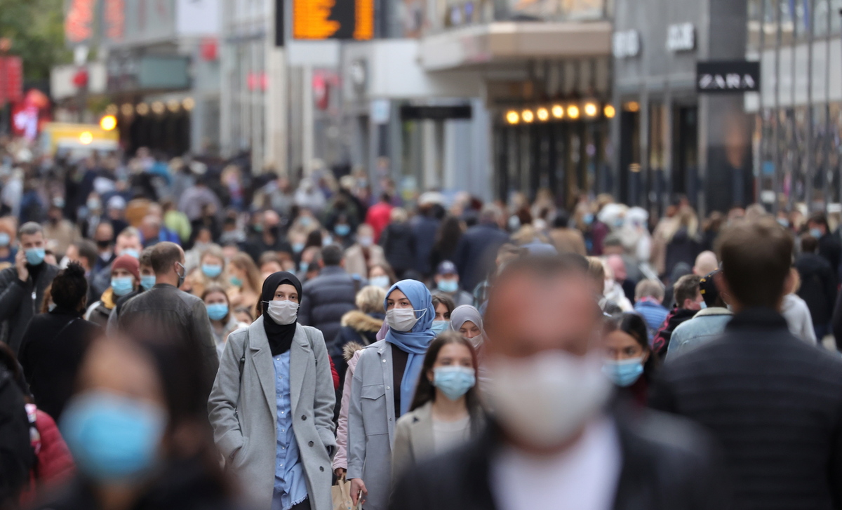Πεζοί που φορούν μάσκες προσώπου στο κέντρο της πόλης του Ντόρτμουντ της Γερμανίας, 24 Οκτωβρίου 2020. Σε όλη τη Γερμανία, ο αριθμός των περιπτώσεων της νόσου COVID-19 που προκαλείται από τον κοροναϊό SARS-CoV-2 αυξάνεται. EPA / FRIEDEMANN VOGEL