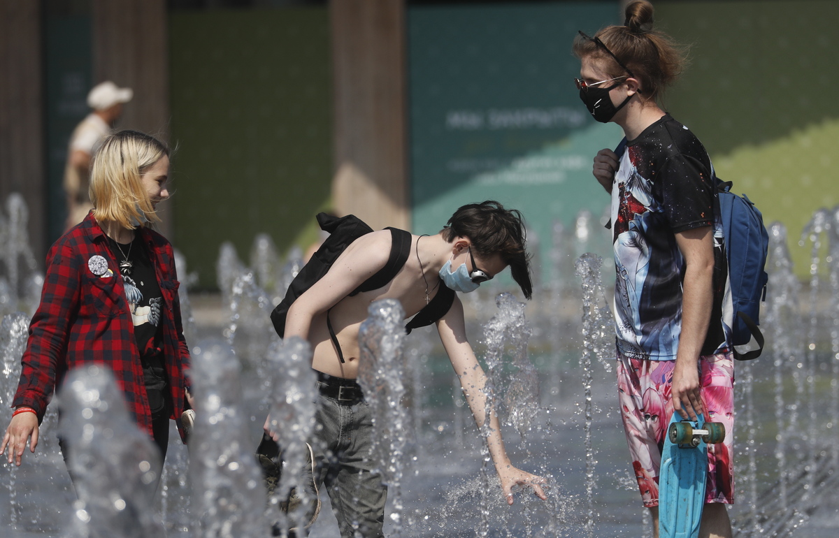 epa08481202 People play with water enjoying a hot weather after ending lockdown to combat the spread of the SARS-CoV-2 coronavirus in Moscow, Russia, 12 June 2020. As of 09 June Moscow authorities will cancel self-isolation regime. All residents of the city, including people over 65 and with chronic illnesses, will be able to go out and travel without restrictions. Beauty salons and hairdressers, as well as a photo studio in Moscow resume work as usual. The requirement to wear masks and gloves in public places will continue. EPA/SERGEI ILNITSKY