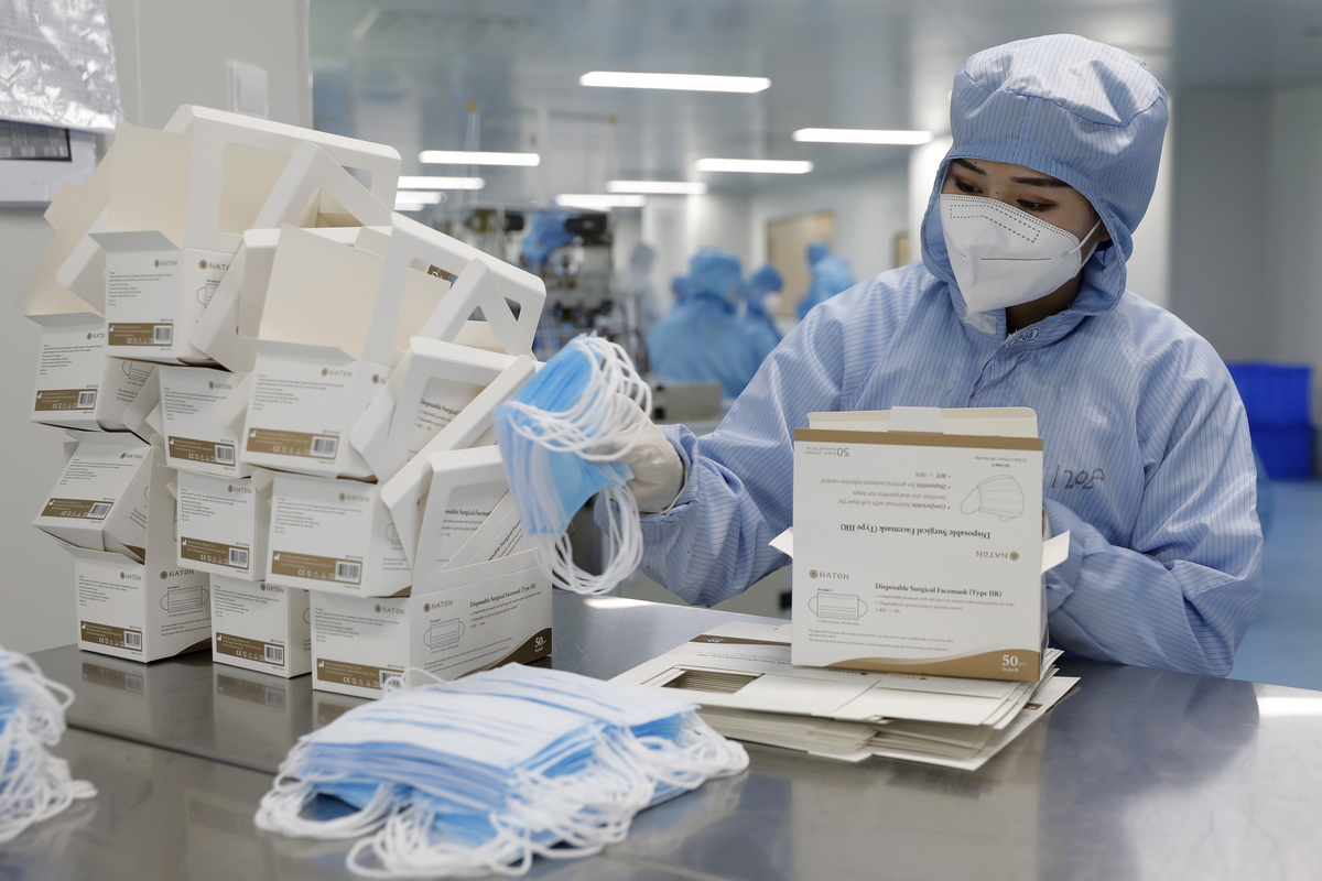 epa08391826 A worker wearing a protective suit and a face mask packs up mask products at a factory of the Naton Technology Group in Beijing, China, 29 April 2020, amid the ongoing coronavirus COVID-19 pandemic. Established in 1996, the Naton Technology Group in Beijing's Haidian district previously manufactured surgical orthopedic products to hospitals across China. It has been involved in protective face mask production since February 2020 and so far it can produce about five million face masks per day. EPA/WU HONG