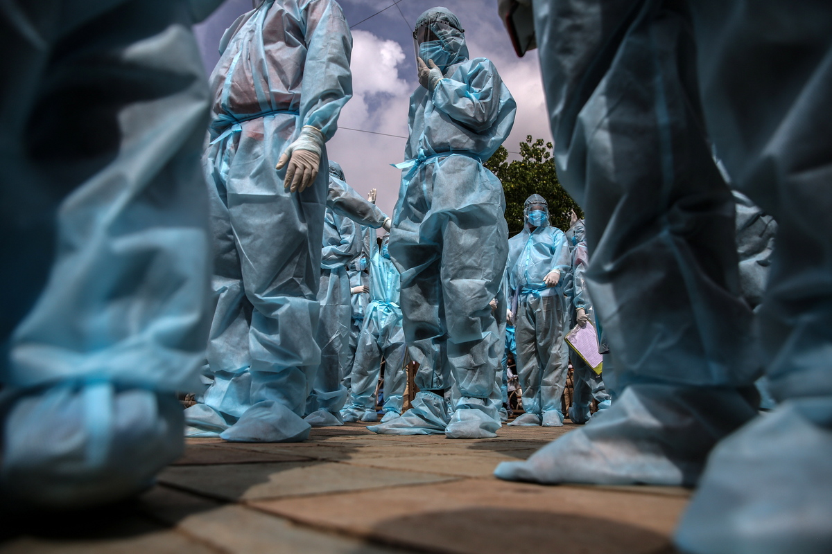 epa08490338 Indian healthcare workers and volunteers of Rashtriya Swayamsevak Sangh (RSS) wearing personal protective equipment (PPE) arrive to conduct medical check-up on residents at Ramabai Ambedkar Nagar, in Mumbai, India, 17 June 2020. According to media reports, the number of confirmed cases of coronavirus in India rose to more than 354,000 and more than 11,000 people deaths. EPA/DIVYAKANT SOLANKI