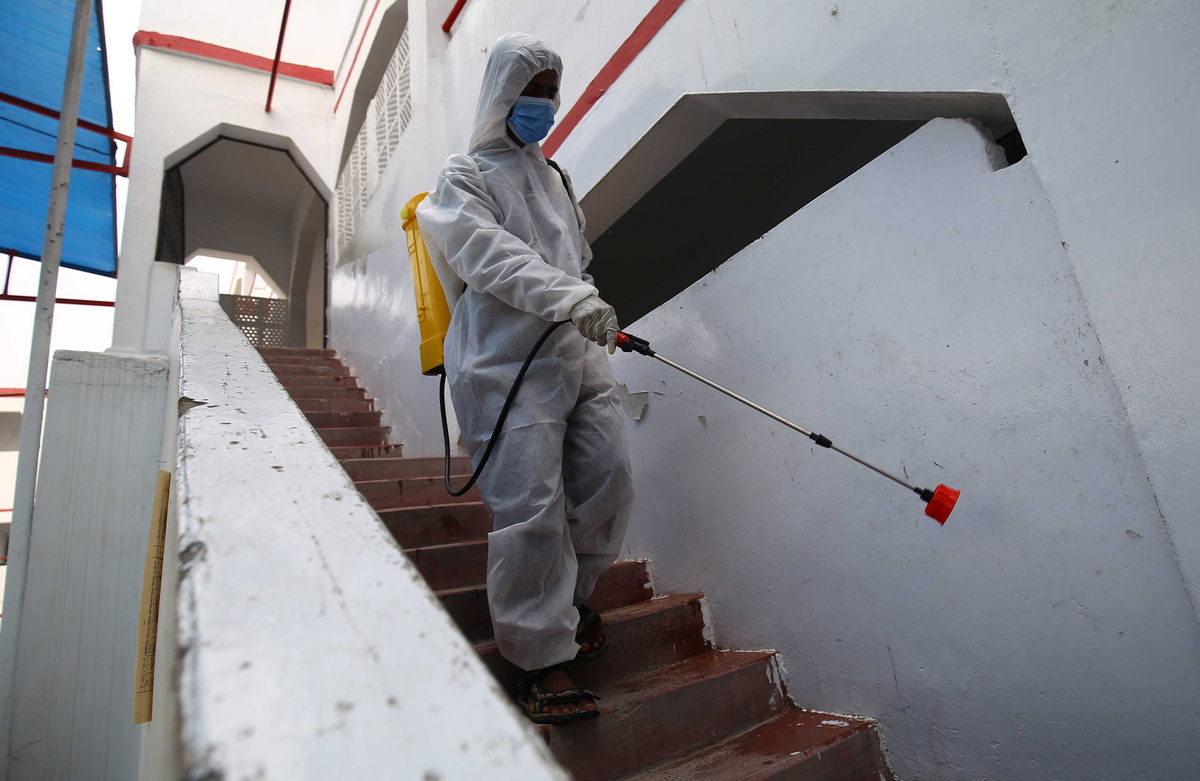 epa08668394 A worker disinfects premises of an educational institute on the eve of its reopening, in Karachi, Pakistan, 14 September 2020. The Pakistani government on 07 September announced the opening of educational institutions in the country in phases starting on 15 September, as cases of COVID-19 infections continue to decline. EPA/SHAHZAIB AKBER