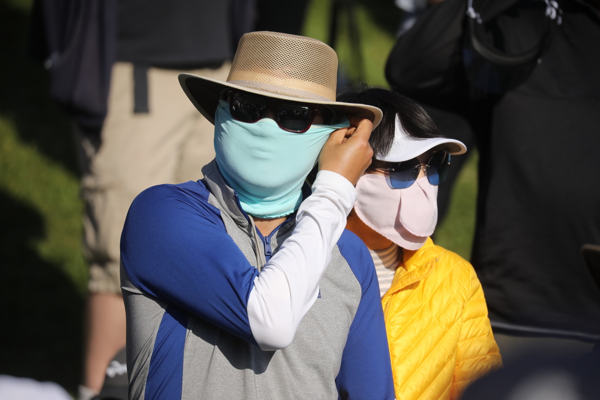 epa08223164 Fans in masks watch as Australian golfer Adam Scott, at the 18th hole, wins the Genesis Invitational at The Riviera Country Club in Pacific Palisades, California, USA, 16 February 2020. EPA/DAVID SWANSON