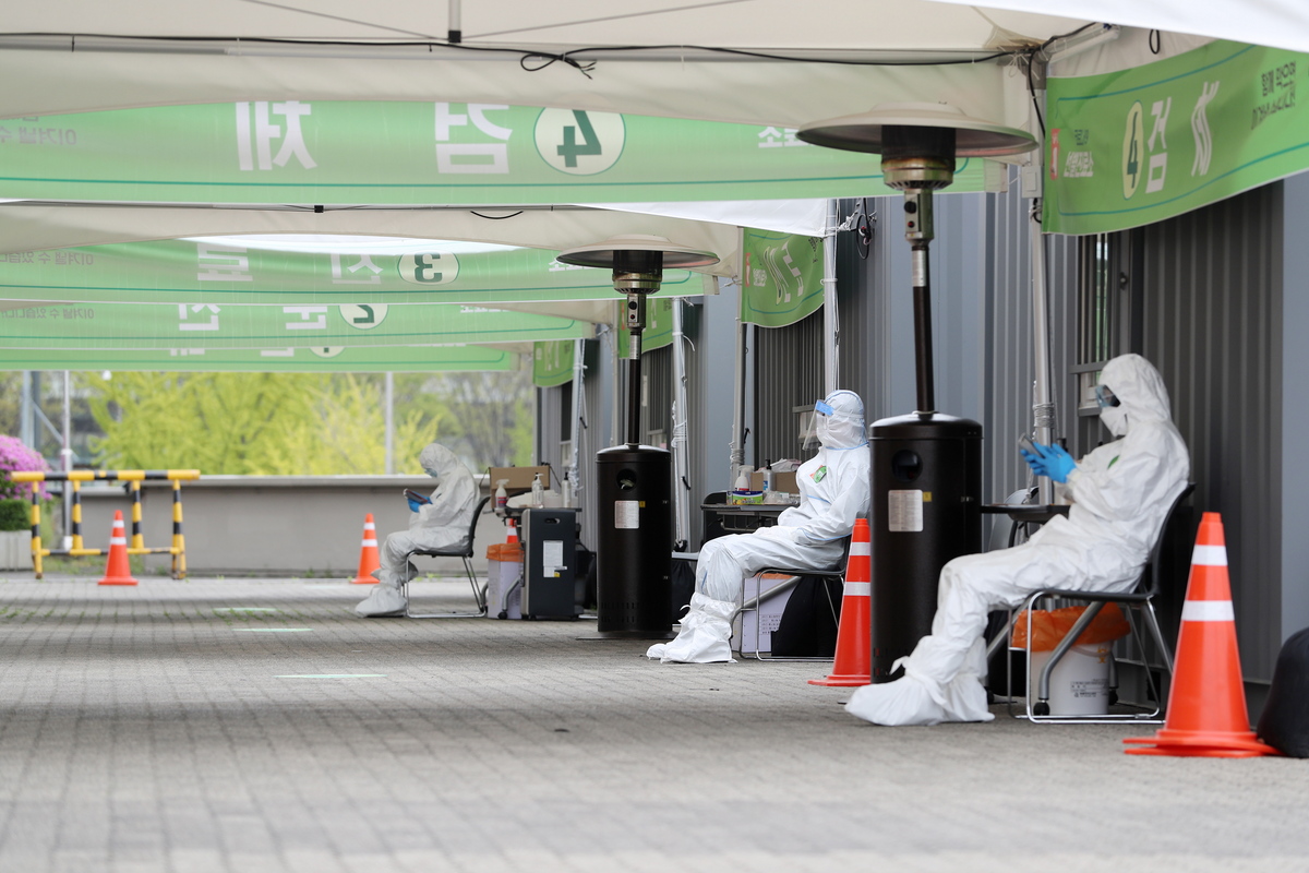 epa08371451 A drive-thru testing center at Jamsil Sports health workers wait for cars at a quiet drive through coronavirus testing area in Seoul, South Korea, 19 April 2020. EPA/YONHAP SOUTH KOREA OUT