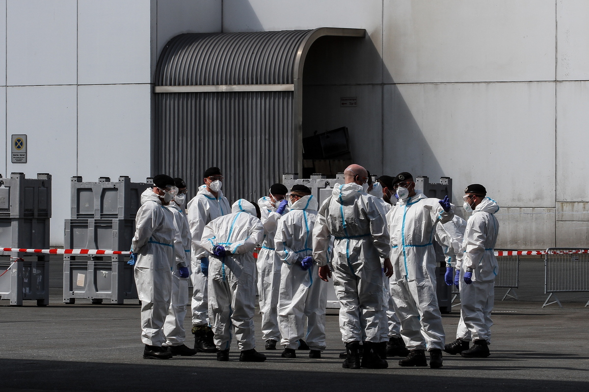 epa08497272 A handout photo made available by the German armed forces (Bundeswehr) shows soldiers taking coronavirus tests from workers at the Toennies meat factory in Rheda-Wiedenbrueck, western Germany, 19 June 2020 (issued 20 June 2020). According to media reports, more than 800 Toennies workers at the Rheda-Wiedenbrueck plant – Europe's largest slaughterhouse – have tested positive for the SARS-CoV-2 coronavirus that causes the COVID-19 disease, making it one of the largest clusters of the ongoing pandemic detected so far in the country. EPA/KORTE / BUNDESWEHR / HANDOUT HANDOUT EDITORIAL USE ONLY/NO SALES