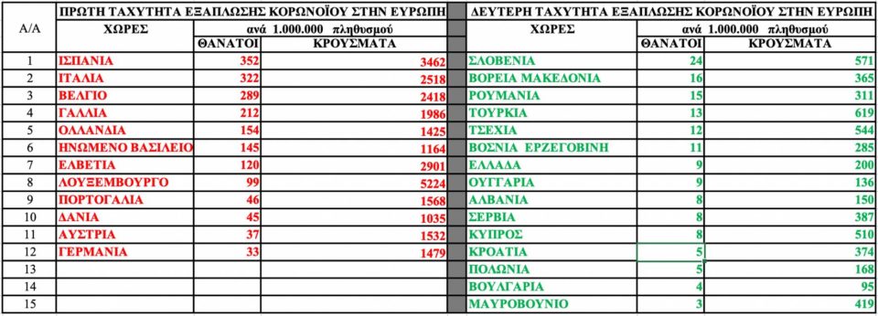 Σε κάθε περίπτωση και μέχρι να εξηγηθούν από τους ειδικούς επιστήμονες οι επιδημιολογικές αιτίες της διαφοροποίησης ανάμεσα σε αυτές τις δύο κατηγορίες χωρών, το βέβαιο είναι πως η Ελλάδα πρέπει να συγκρίνεται όχι μόνο με την Ιταλία και την Ισπανία αλλά και με τη Σλοβενία και τη Βουλγαρία.