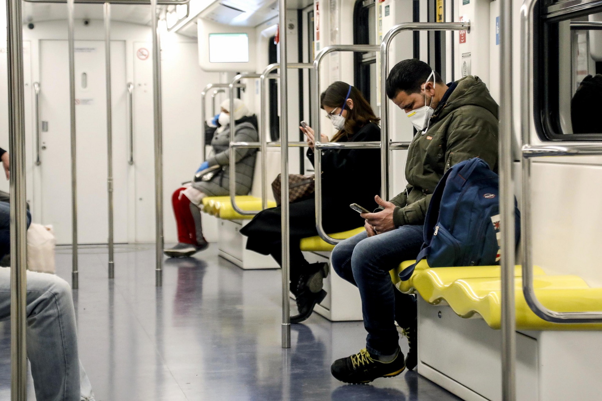 epa08303407 People wearing protective masks travel on the number two metro line in Milan, Italy, 18 March 2020. According to media reports, Italy's death toll from the coronavirus outbreak has surpassed 2,500. EPA/Mourad Balti Touati