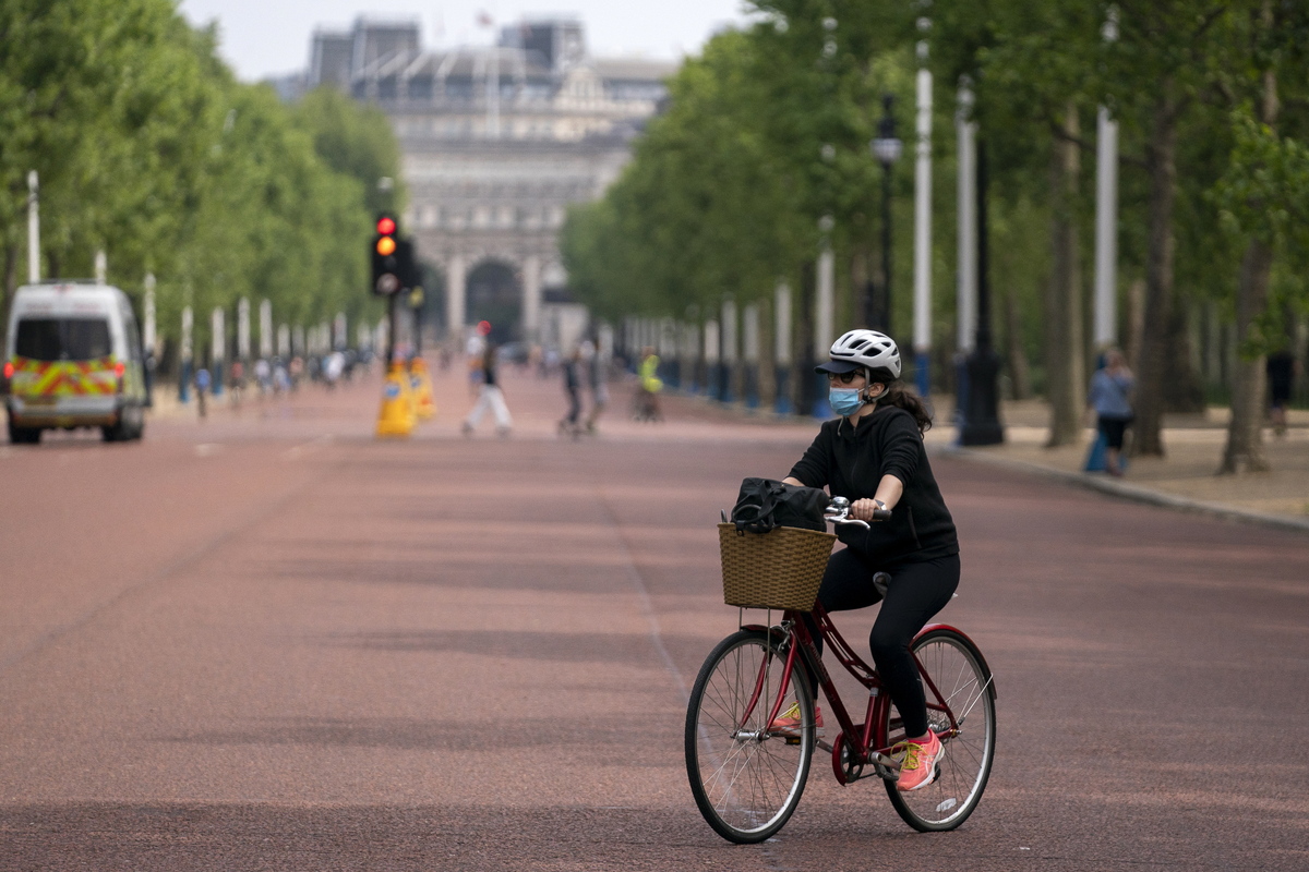 epa08412936 A cyclist in a protective mask rides in The Mall, London, Britain, 10 May 2020. Britons are now in their sixth week of lockdown due to the Coronavirus pandemic. Countries around the world take measures to stem the widespread of the SARS-CoV-2 coronavirus which causes the Covid-19 disease. EPA/WILL OLIVER