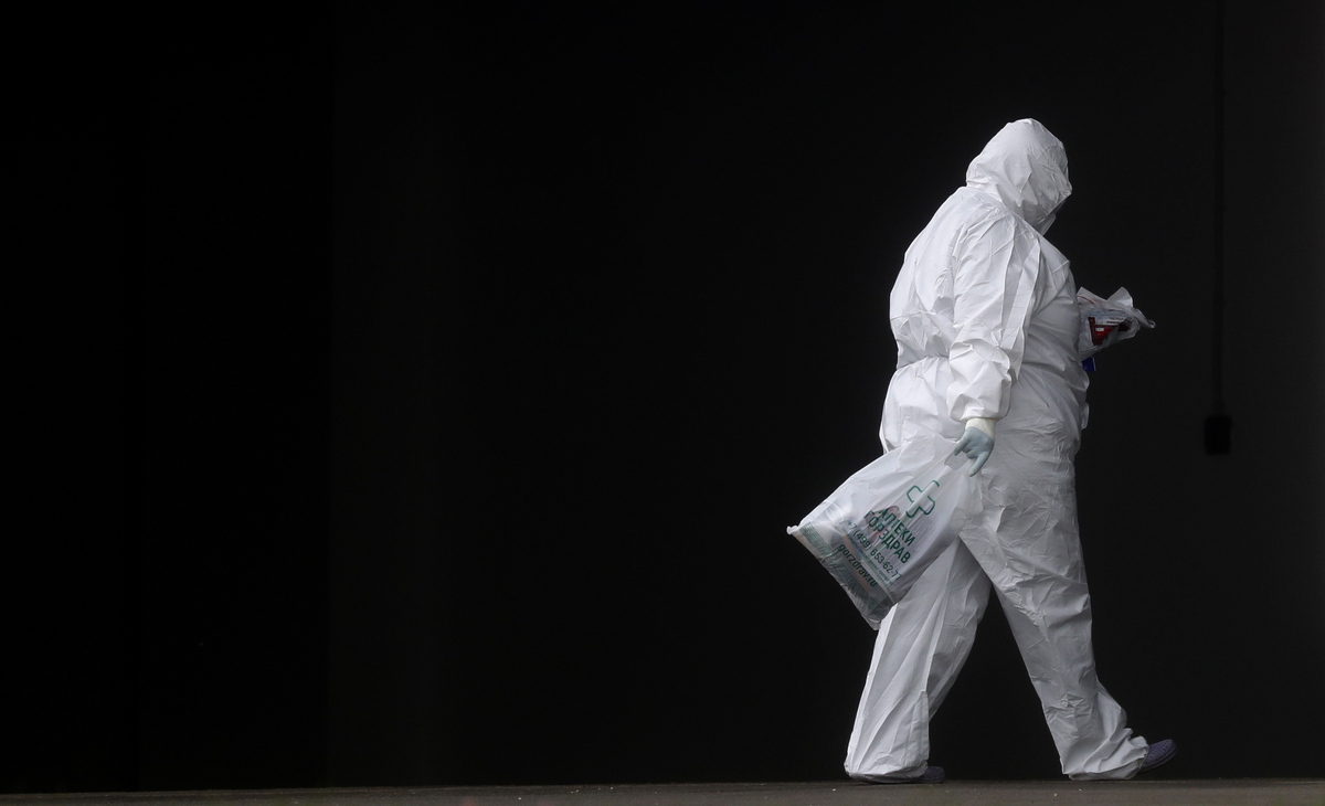 epa08603614 A medical specialist in a protective suit waits for patients at the hospital complex for patients with the COVID-19 disease caused by the SARS-CoV-2 coronavirus in the Kommunarka settlement in New Moscow, Russia, 14 August 2020. Russia registered the new called Sputnik V vaccine against coronavirus SARS-CoV-2 and opens the stage of its massive testing. EPA/MAXIM SHIPENKOV