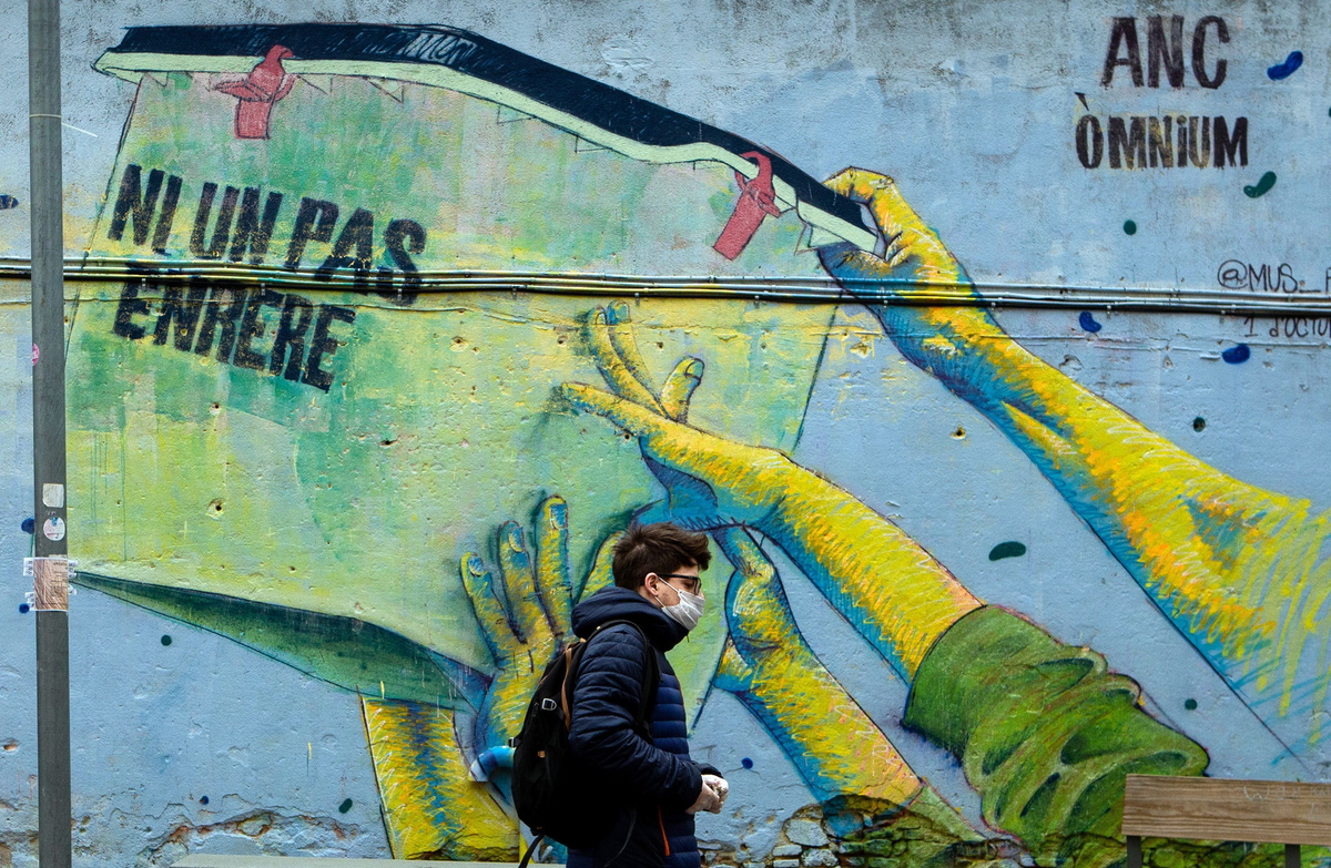 epa08299964 A man wearing a protective mask walks along a street in Barcelona, Spain, 17 March 2020. Spain faces its third day of the 'state of alert', declared by Spanish central government, with the closure of borders amid the outbreak of coronavirus. EPA/ENRIC FONTCUBERTA