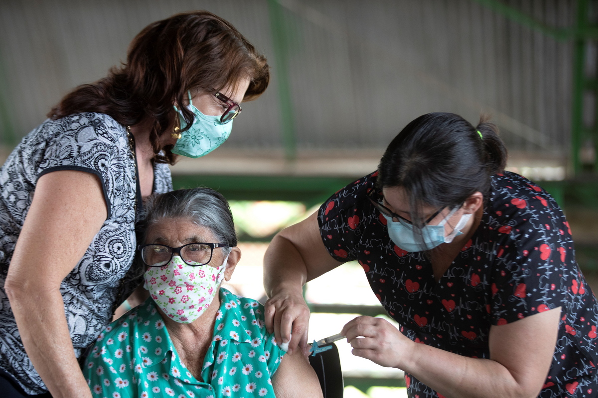 A woman receives the vaccine against covid-19, in Brasilia, Brazil, 01 February 2021. The Brasilia Ministry of Health began in different parts of the city another stage of vaccination against covid-19 exclusively for people 80 years of age or older. EPA/Joedson Alves