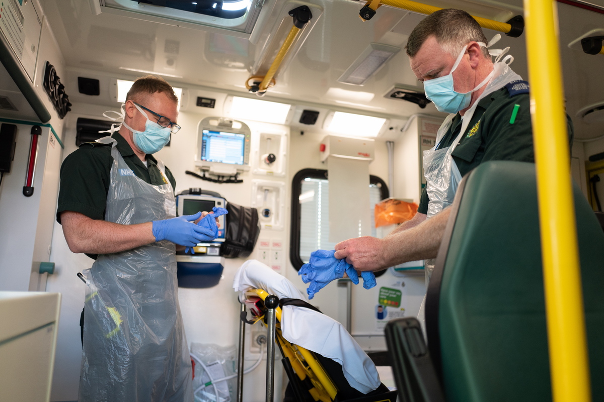 epa08407491 Paramedics don protective clothing, after responding to a 999 call, on May 06, 2020 near Portsmouth, England. As the list of recognised Covid-19 symptoms grows, paramedic crews like those with the South Central Ambulance Service are forced to treat every patient as being a potential case, often requiring specialised personal protective equipment (PPE). Paramedics now routinely don what the NHS refers to as Level 2 PPE, like face masks and disposable aprons. Cases with patients potentially needing airway procedures require Level 3 PPE, such as full-face visors and long-sleeved surgical gowns. While the infection rate is falling, and government officials are discussing ways to relax the country's quarantine measures, Covid-19 still creates everyday risks for paramedics and other first responders. EPA/Leon Neal / POOL