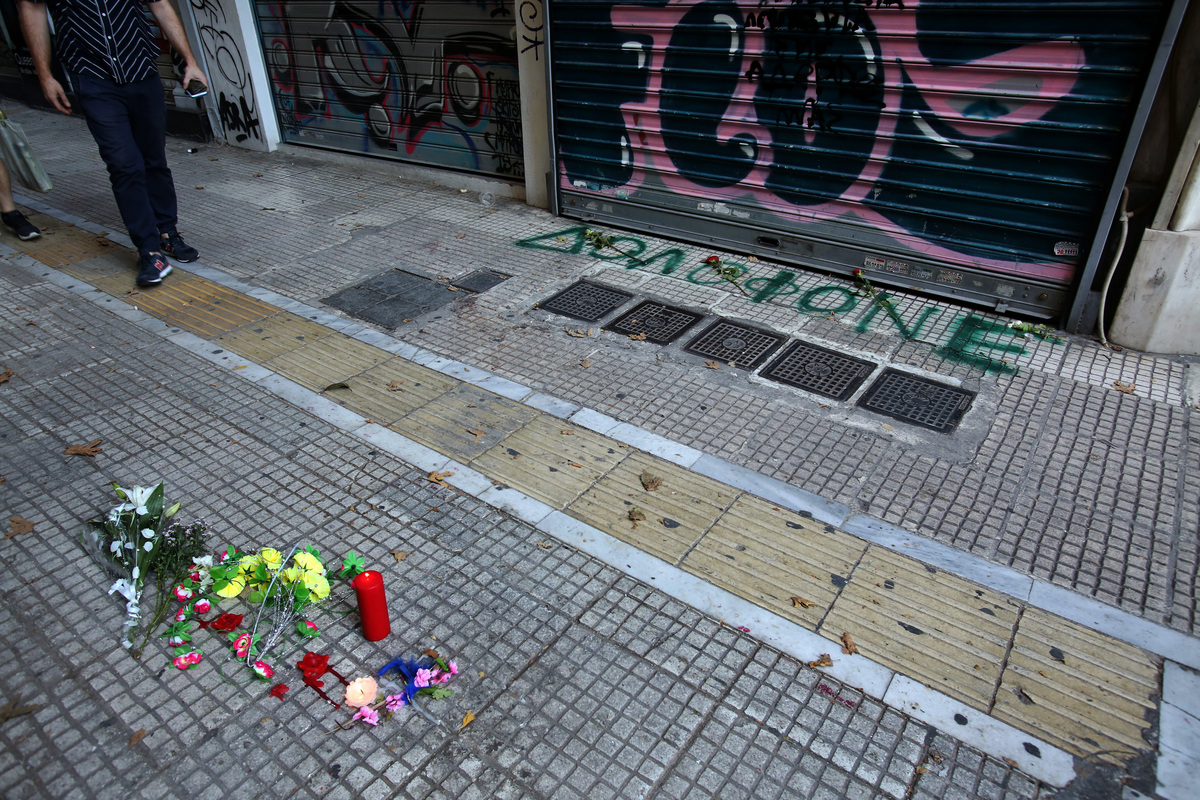 Άγνωστοι έγραψαν τη λέξη "Δολοφόνε" και συνθήματα στα ρολά, ενώ άφησαν λουλούδια έξω από το κοσμηματοπωλείο της οδού Γλάδστωνος στο κέντρο της Αθήνας, όπου βρήκε τραγικό θάνατο ο 33χρονος ακτιβιστής για τα δικαιώματα των ΛΟΑΤΚΙ, Ζακ Κωστόπουλος, Κυριακή 23 Σεπτεμβρίου 2018. ΑΠΕ-ΜΠΕ/ ΑΠΕ-ΜΠΕ/ ΣΥΜΕΛΑ ΠΑΝΤΖΑΡΤΖΗ