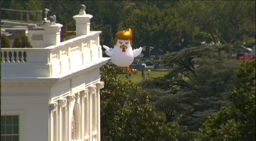 Ένα γιγάντιο φουσκωτό κοτόπουλο με χρυσά μαλλιά επισκέφτηκε τον Λευκό οίκο.