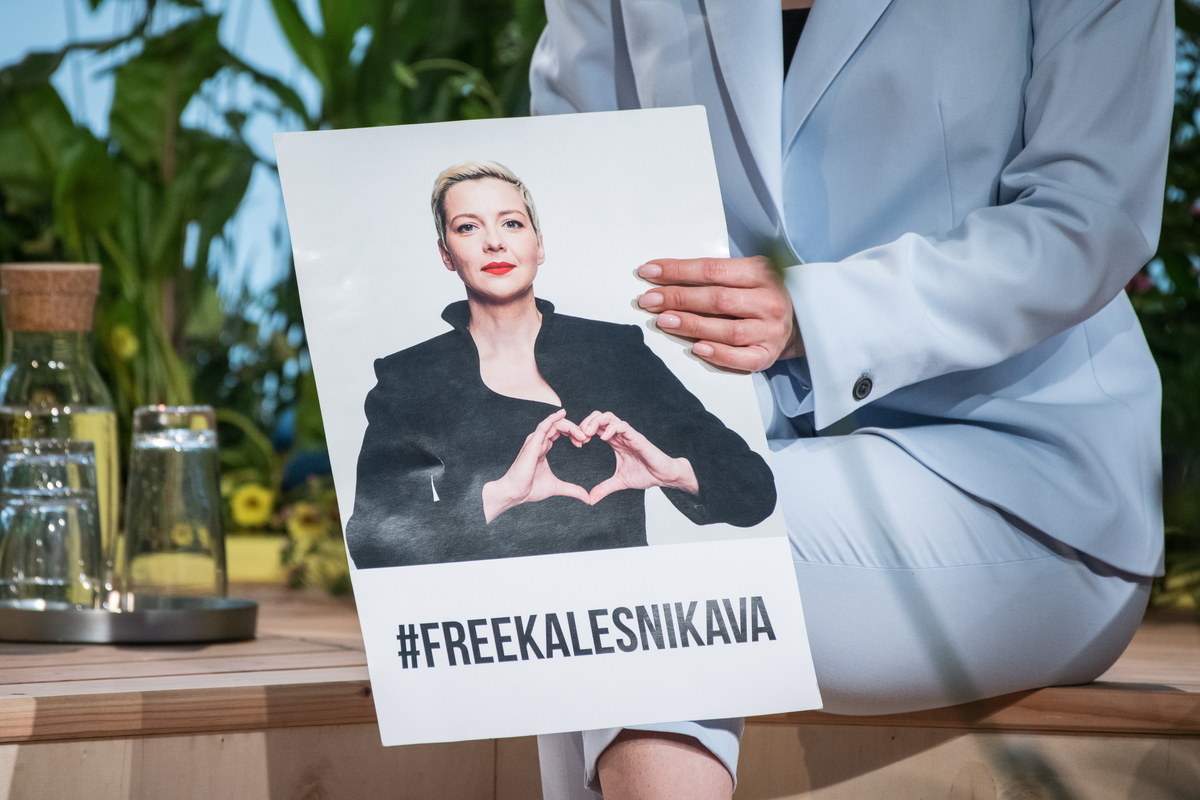 epa09266562 Tatsiana Khomich, sister of Belarusian opposition politician Maria Kalesnikava, holds a banner with a picture of her sister with the hashtag freekalesnikava, as she attends the virtual federal party of the Greens party congress in Berlin, Germany, 13 June 2021. Germany is to hold federal elections in September 2021. EPA/STEFFI LOOS / POOL