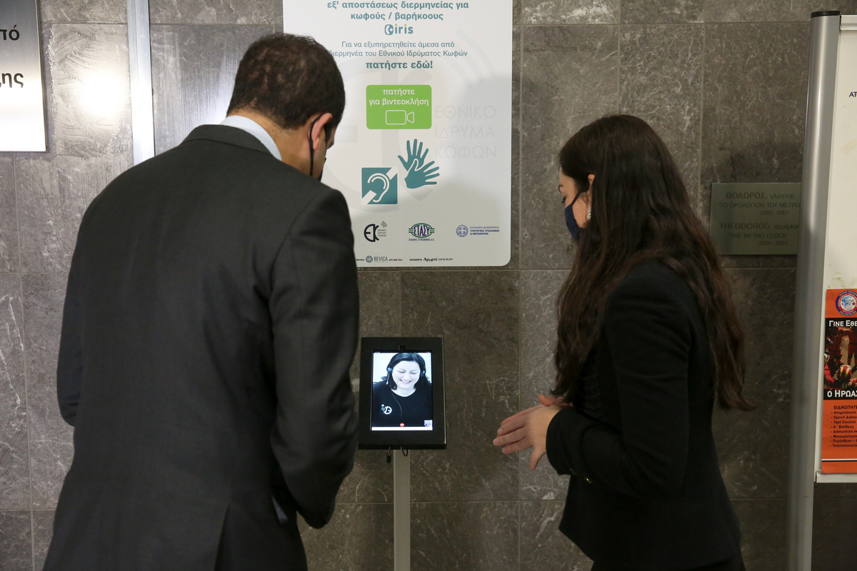 Τέλος, η κ. Λαμπροπούλου τόνισε ότι «το Εθνικό Ίδρυμα Κωφών δημιούργησε και λειτουργεί με μεγάλη επιτυχία την υπηρεσία της εξ αποστάσεως παροχής διερμηνείας, προσφέροντας μηνιαίως σε περίπου 10.000 κωφούς και βαρήκοους συμπολίτες μας, για πρώτη φορά στη χώρα μας, δωρεάν πρόσβαση σε 24ωρη βάση στα κοινωνικά αγαθά επικοινωνίας με τον υπόλοιπο κόσμο. Στο πλαίσιο υλοποίησης του παραπάνω έργου τοποθετείται ειδικός σταθμός επικοινωνίας στον σταθμό του Μετρό Συντάγματος, ο οποίος θα διευκολύνει την πρόσβαση των κωφών/βαρήκοων επιβατών στην επικοινωνία τους μέσα στους χώρους του Μετρό».