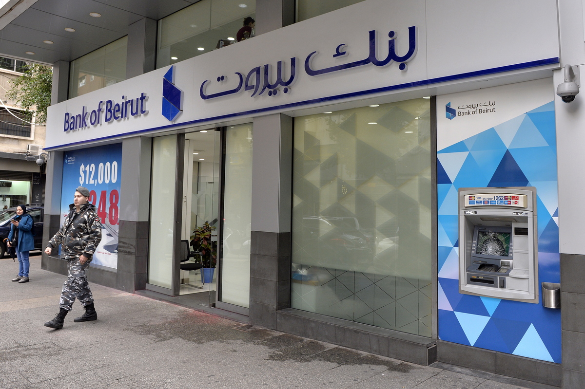 epa08132647 A damaged ATM machine at a Bank of Beirut branch which was vandalized by anti-government protesters in Beirut, Lebanon, 16 January 2020. Anti-government protesters clashed with police overnight near police barracks during a protest demanding the release of 59 of their comrades who were detained during clashes near Lebanese Central Bank on 14 January. EPA/WAEL HAMZEH
