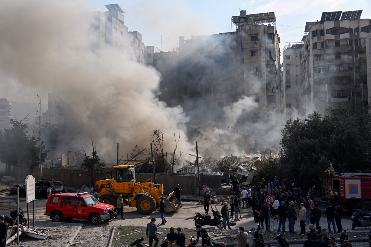 epa11696081 Firefighters work to extinguish a fire at the site of an Israeli military strike in the Kafaat area of the Dahieh district in Beirut, Lebanon, 01 November 2024. According to the Lebanese Ministry of Health, more than 2,800 people have been killed and over 13,000 others have been injured in Lebanon since the start of recent escalations of hostilities. EPA/WAEL HAMZEH