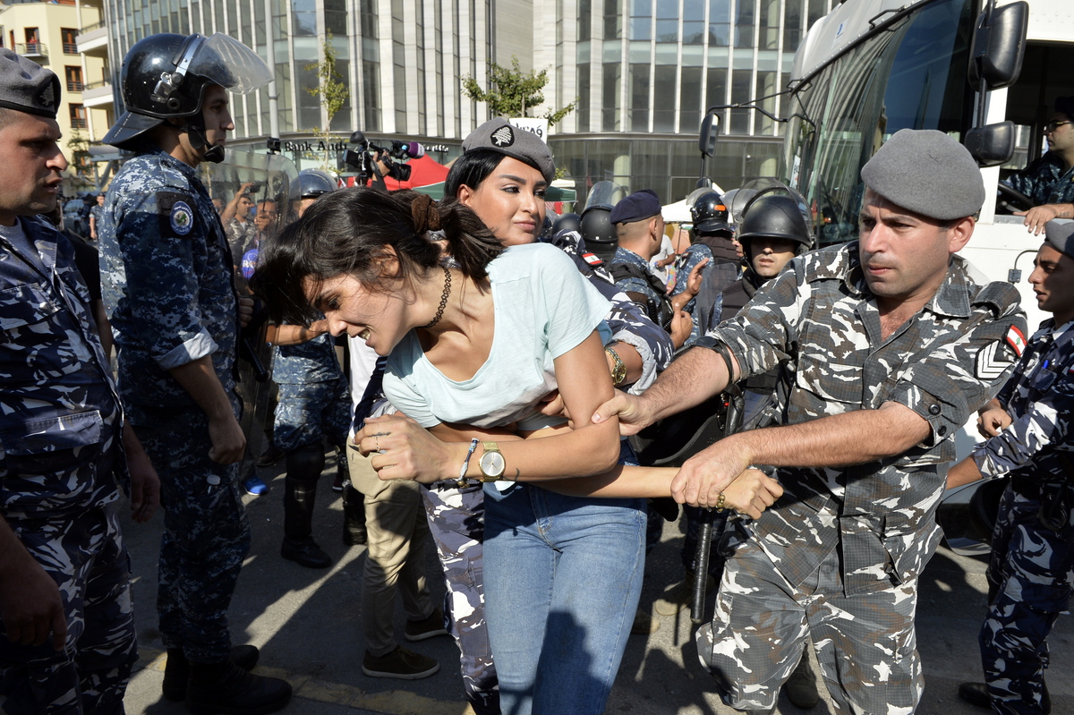 epa07961989 Lebanese riot police remove a woman anti-government protester, one of many blocking the main highway during ongoing anti-government protests near downtown in Beirut, Lebanon, 31 October 2019. Thousands of Lebanese started to open the streets in all the areas as they give time to the Lebanese President and parliament to form a new government, where they will continue to protest in the main squares in all the Lebanese provinces on the second week of demonstrations against proposals of tax hikes, and state corruption. EPA/WAEL HAMZEH