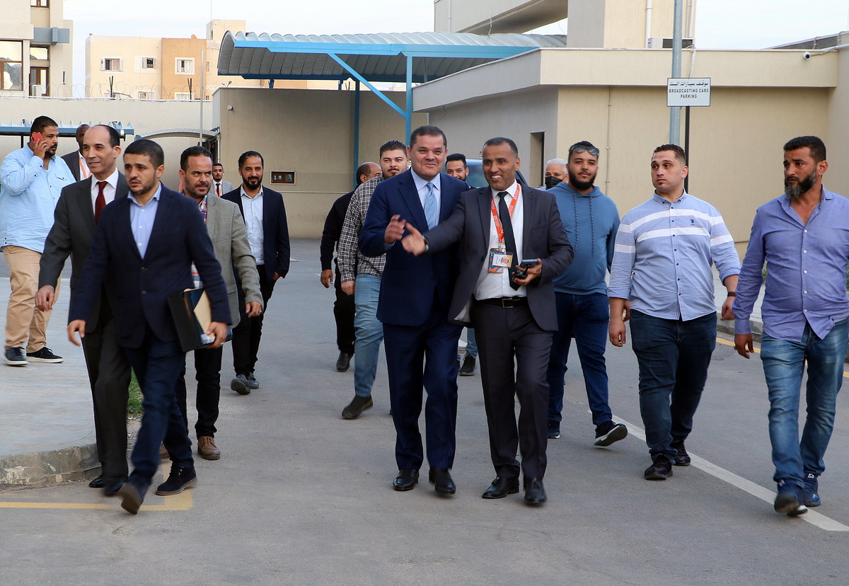 epa09596182 Libyan Prime Minister Abdul Hamid Dbeibah (C) arrives to submit his candidacy papers for the upcoming presidential election at the headquarters of the Electoral Commission in Tripoli, Libya on 21 November 2021. EPA/STR