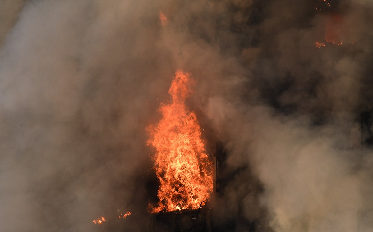 epa06027155 Flames come out of a window at the Grenfell Tower, a 24-storey apartment block in North Kensington, London, Britain, 14 June 2017. According to the London Fire Brigade, 40 fire engines and 200 firefighters are working to put out the blaze. Residents in the tower were said to be evacuating and a number of people were treated for a 'range of injuries,' Metropolitan Police said. EPA/FACUNDO ARRIZABALAGA