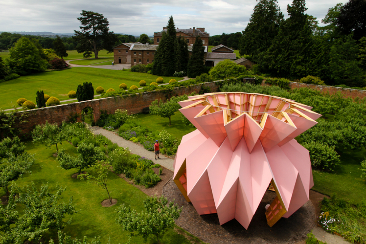 Σε αυτόν τον όμορφο κήπο, η Χίδερ και ο Ίβαν Μόρισον (του στούντιο Μόρισον), με τη στήριξη του Trust New Art (του National Trust, του οργανισμού που φροντίζει για την προστασία της βρετανικής πολιτιστικής κληρονομιάς) και του Art Council England (του ισοδύναμου του δικού μας Υπουργείου Πολιτισμού), εγκατέστησαν ένα περίπτερο, σε σχήμα ανανά, που παραπέμπει σε οριγκάμι.