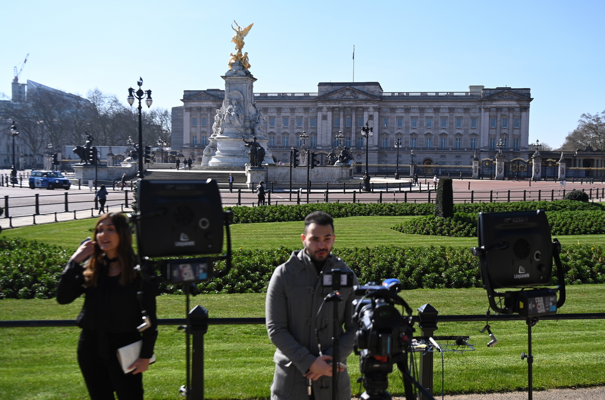 epa09063752 Media outside Buckingham Palace in London, Britain, 09 March 2021. US channel CBS aired a television interview with Britain's Harry and Meghan, Duke and Duchess of Sussex on 07 March. Buckingham Palace is yet to respond to racism allegations following the TV interview that was broadcast in the UK on 08 March. EPA/ANDY RAIN