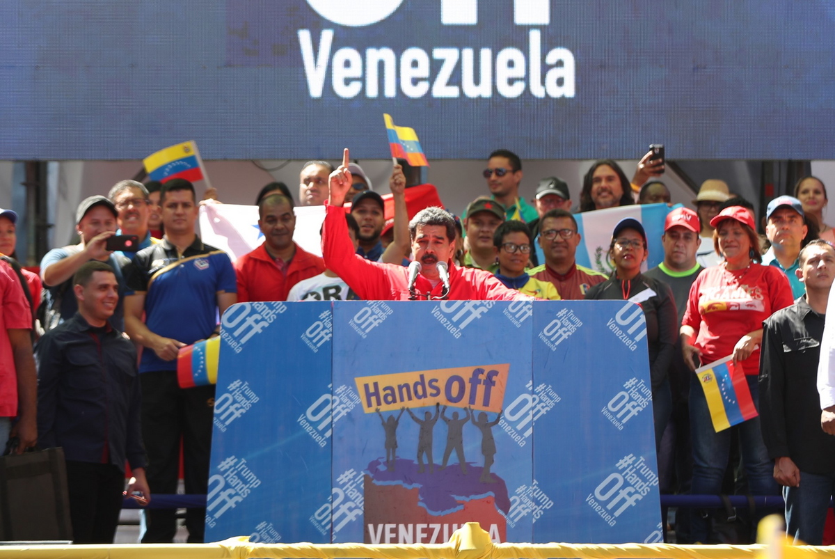 epa07391277 Venezuelan President Nicolas Maduro speaks to supporters, in Caracas, Venezuela, 23 February 2019. EPA/Raúl Martínez